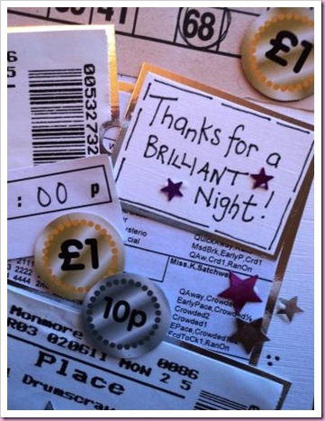 I think one of my most irritating habits after a night out is gathering all the little bits and pieces I can find and shoving them into my bag! Sometimes I don’t do anything with them, but this time, after a brilliant night out at “The Dogs”, I wanted to put it all together to make a Thank You card for the friends who organised the evening.