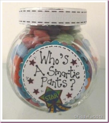 I’ve put self adhesive ribbon round the jar lid and then added a “Smartie Pants” label to the front and back using punched shapes, stickers from Hobbycraft, a bit of handwriting and a few stars. Done and dusted!