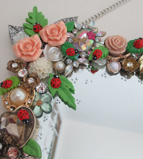 That said, I got out my broken jewellery and first divided the pink roses (from Poundland bracelets) in two piles so that there would be at least a little symmetry between the two mirrors. Using E600 glue I started working in the four corners of each mirror, before gradually filling the sides with pieces of roughly equal size, followed by layering above and below with smaller bits.